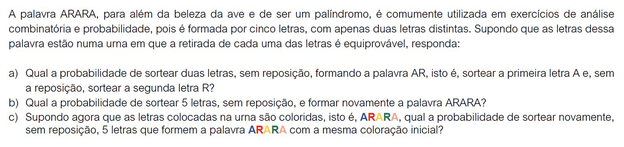 b) Para formar a palavra ARARA, retirando-se as letras sem reposição, deve-se sortear as letras A, R, A, R e A nessa ordem, ou seja, começar estilo tamanho matemático 14px espaço 3 sobre 5 vezes 2 sobre 4 vezes 2 sobre 3 vezes 1 meio vezes 1 sobre 1 igual a 1 sobre 10 fim do estilo