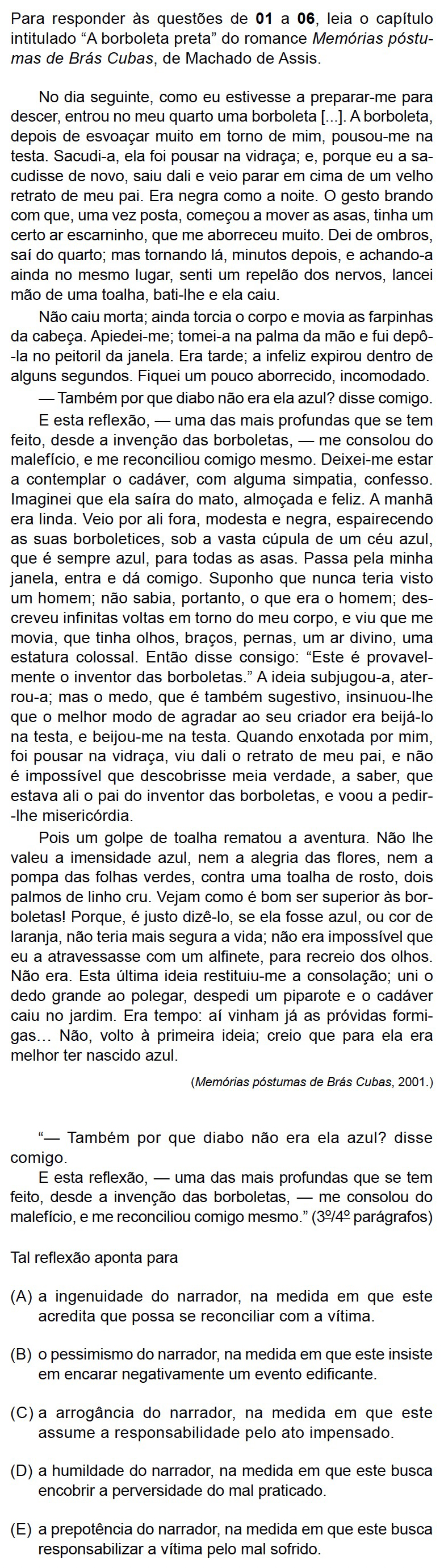 A reflexão do narrador (“— Também por que diabo não era ela azul? … Esta reflexão… me consolou do malefício…”) revela prepotência e um deslocamento cínico de culpa: ele tenta justificar a agressão responsabilizando a própria borboleta — não por ter feito algo, mas por não ser azul. Trata-se de uma racionalização irônica e autoindulgente, típica do narrador de Memórias póstumas, que converte a violência em capricho estético e, em vez de assumir a responsabilidade, atribui o mal sofrido à vítima.