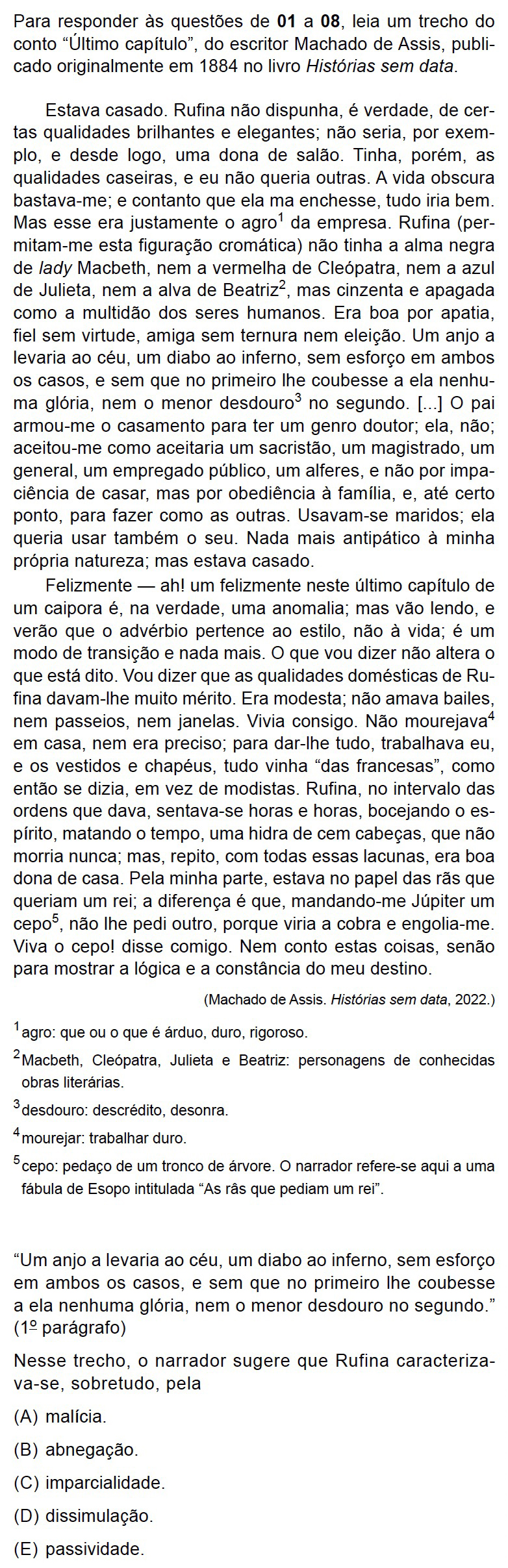 No trecho citado — “Um anjo a levaria ao céu, um diabo ao inferno, sem esforço em ambos os casos, e sem que no primeiro lhe coubesse a ela nenhuma glória, nem o menor desdouro no segundo.” — o narrador afirma que Rufina não teria participação ativa em nenhum dos destinos: nem mereceria a glória do céu, nem seria responsável pela culpa do inferno. Essa formulação irônica caracteriza uma completa ausência de atitude, isto é, ela não age, apenas é levada. O efeito é de anulação da vontade própria, elemento típico da passividade.