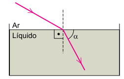 Um raio de luz monocromática, propagando-se pelo ar, incide sobre um líquido em equilíbrio contido em um recipiente, é refratado e passa a propagar-se por esse líquido em uma direção inclinada de um ângulo α em relação à superfície do líquido, conforme a figura.
