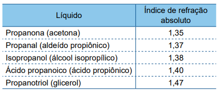 A tabela apresenta cinco líquidos que podem estar no interior desse recipiente e seus respectivos índices de refração absolutos.