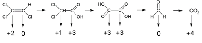 O processo de remediação de águas subterrâneas baseia-se em reações de oxirredução, pois observamos a variação no número de oxidação dos átomos de carbono na cadeia carbônica, conforme o esquema abaixo: