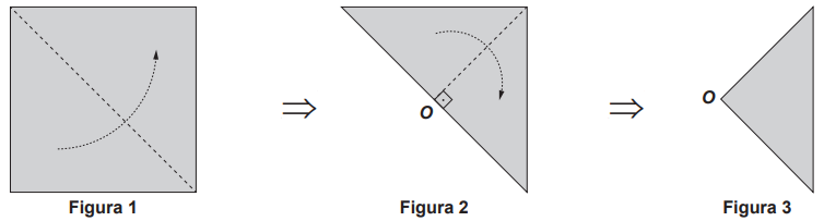 • Dobrar uma folha de papel em formato quadrado duas vezes, em sequência, ao longo das linhas tracejadas, conforme ilustrado nas figuras 1 e 2, para obter o papel dobrado, conforme Figura 3.