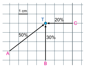 O mapa, feito em malha quadriculada, indica três vetores com direções, sentidos e módulos das velocidades médias dos ventos que incidiram sobre uma turbina eólica giratória, indicada pelo ponto T, durante 24 horas de determinado dia do ano. Nesse dia, a turbina recebeu ventos apenas de A, B e C, sendo que as porcentagens associadas a cada vetor indicam a fração do dia em que tais ventos incidiram em T.