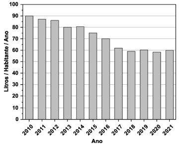 O gráfico a seguir apresenta o consumo médio de refrigerante por habitante por ano, no período de 2010 a 2021, no Brasil.