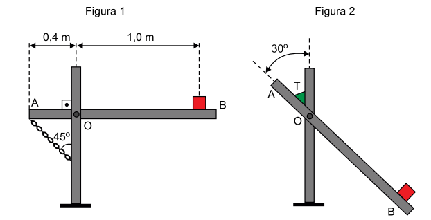 As figuras 1 e 2 mostram uma caixa de massa 4 kg apoiada, em repouso, sobre uma barra AB de massa desprezível ligada, pela articulação O, a uma torre vertical fixa. Na situação da figura 1, a barra é mantida em repouso na horizontal por uma corrente de massa desprezível. Quando a corrente é retirada, deixa-se a barra AB girar lentamente no sentido horário até ser novamente colocada em repouso, presa por uma trava (T), como mostra a figura 2.