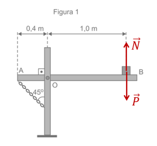 Adotando g = 10 m/s2 e desprezando o atrito na articulação O, calcule, em newtons: