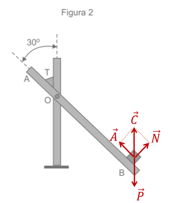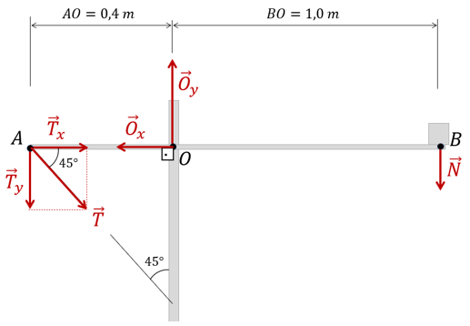 Como a barra AB está em repouso, a soma dos momentos em relação a qualquer ponto é nula. Escolhendo-se o ponto O como polo: