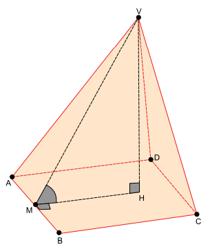 Em uma pirâmide oblíqua de vértice V e base quadrada ABCD de lado 4 cm, o ponto M é médio da aresta AB, o ponto H é o pé da perpendicular da altura da pirâmide que passa por V, o segmento MH é perpendicular à aresta AB, e a distância entre os pontos M e H é 3 cm, conforme mostra a figura.