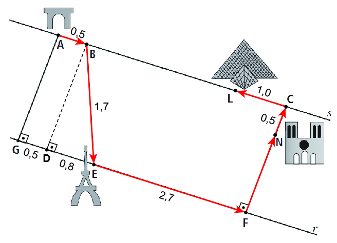 Considere as distâncias AB = CN = 0,5, BL = 2,5, LC = 1, EF = 2,7 e BE = 1,7, dadas em quilômetros. Rayssa visitou os pontos turísticos na seguinte ordem: Arco do Triunfo, Torre Eiffel, Catedral de Notre-Dame e Museu do Louvre, percorrendo a menor distância possível, nas ruas indicadas na figura. Qual foi a distância que ela percorreu? Justifique.
