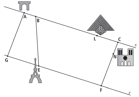 b) Na figura abaixo, o Arco do Triunfo, a Catedral de Notre-Dame, o Museu do Louvre e a Torre Eiffel estão indicados pelos pontos A, N, L e E, respectivamente. Os segmentos de reta na figura representam ruas de Paris. As retas r,s são paralelas e os segmentos de reta AG e CF são paralelos entre si e perpendiculares a r e s.