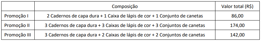 Uma papelaria oferece três diferentes promoções: