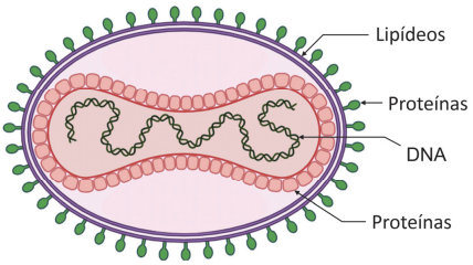 O vírus da mpox possui DNA como material genético, envolto em uma estrutura de proteínas, dentro de uma membrana lipoproteica, conforme esquema abaixo.