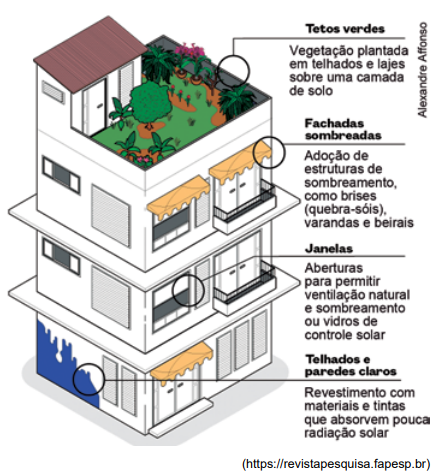Analise a imagem que apresenta técnicas para garantir maior conforto térmico em construções.