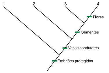 Além das características referidas no cladograma, os grupos de plantas 1, 2, 3 e 4 apresentam, respectivamente,