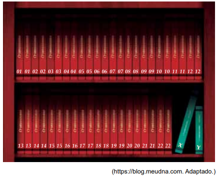 Os livros estão numerados aos pares, sendo 22 deles pares semelhantes e apenas um par com livros de tamanhos diferentes. A imagem se assemelha ao cariótipo humano, que possui 22 pares de cromossomos autossômicos, que são estruturalmente semelhantes, e um par sexual, em que o cromossomo Y tem tamanho menor do que o cromossomo X. Portanto, os livros vermelhos seriam os cromossomos autossômicos e os livros verdes, os cromossomos sexuais.