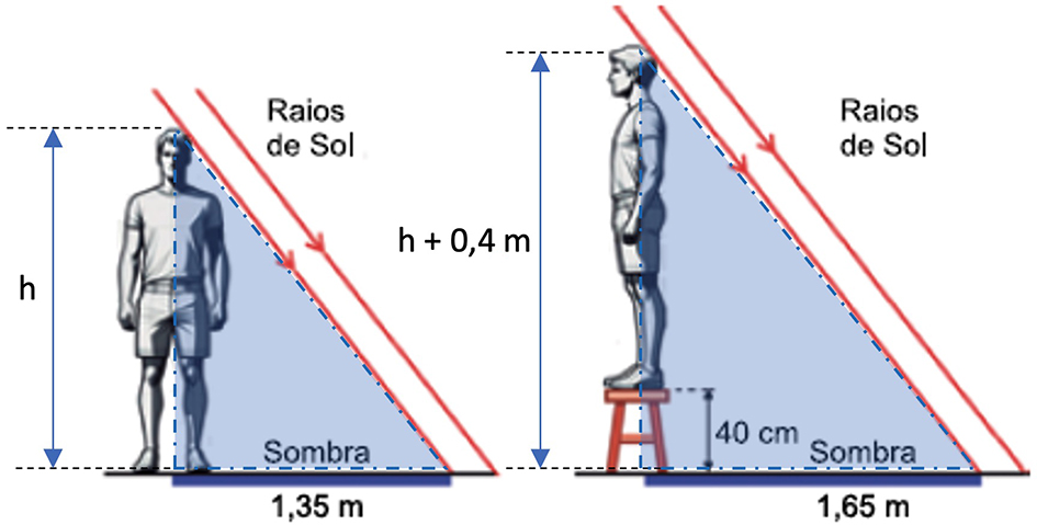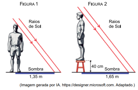 Quando um homem se coloca em pé, projeta sobre o solo plano e horizontal uma sombra com 1,35 m de comprimento, conforme a figura 1. Quando esse mesmo homem sobe em um banco de 40 cm de altura e se mantém em pé, o banco e o homem projetam sobre o solo uma sombra com 1,65 m de comprimento, conforme a figura 2.