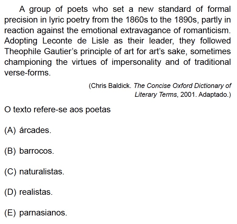 O trecho prova ser parnasianismo por destacar a precisão formal, a reação ao emocionalismo romântico, a busca pela "arte pela arte" e a valorização da impessoalidade e das formas tradicionais. Essas características de rigor técnico e objetividade são centrais para o movimento parnasiano.