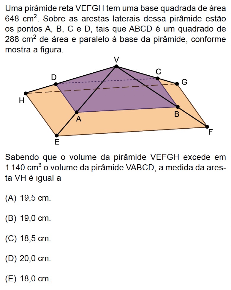 Denotando por V o volume da pirâmide VABCD, em cm3, tem-se que o volume de VEFGH vale A razão entre estes volumes é dada por k3 e vale
