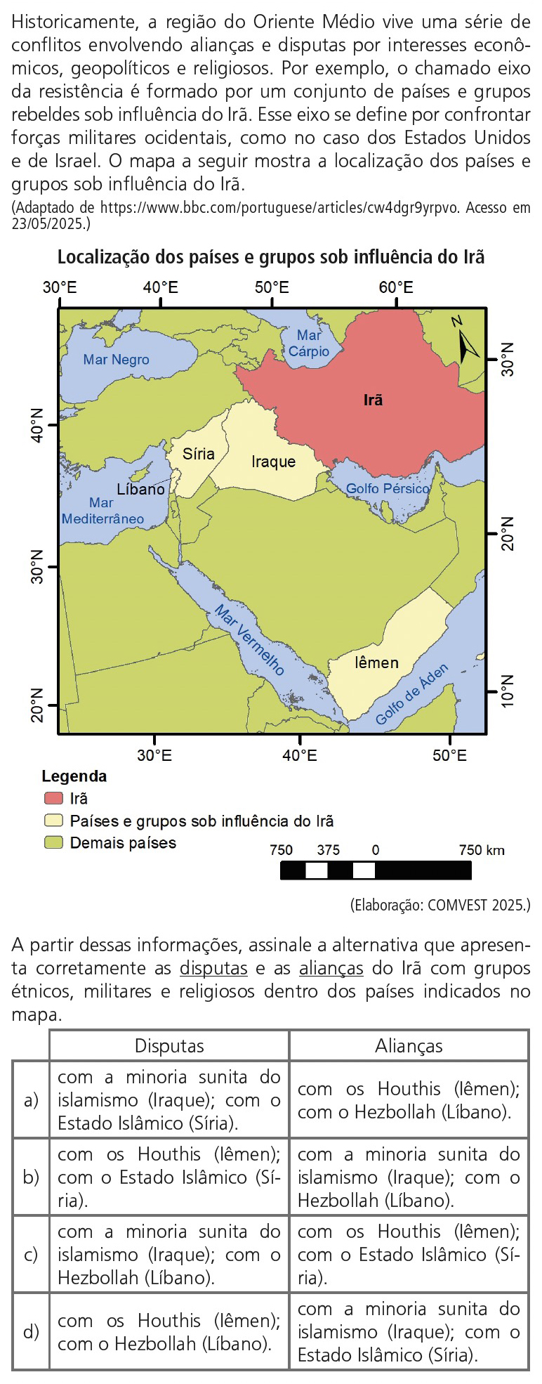 As atuais tensões no Oriente Médio, em especial as que envolvem a questão palestina, abrangem diversos grupos e países que conflitam, entre outros motivos, por questões étnicas e religiosas. O Irã, uma teocracia xiita, é acusado de ser o líder e financiador do “eixo da resistência”, que inclui os houthis – grupo iemenita de ramificação xiita – e o Hezbollah – grupo libanês xiita. Vale salientar que grupos sunitas, como o Estado Islâmico, tendem a rivalizar com os xiitas, com exceção do Hamas, que é sunita, mas ainda assim recebe apoio do Irã.