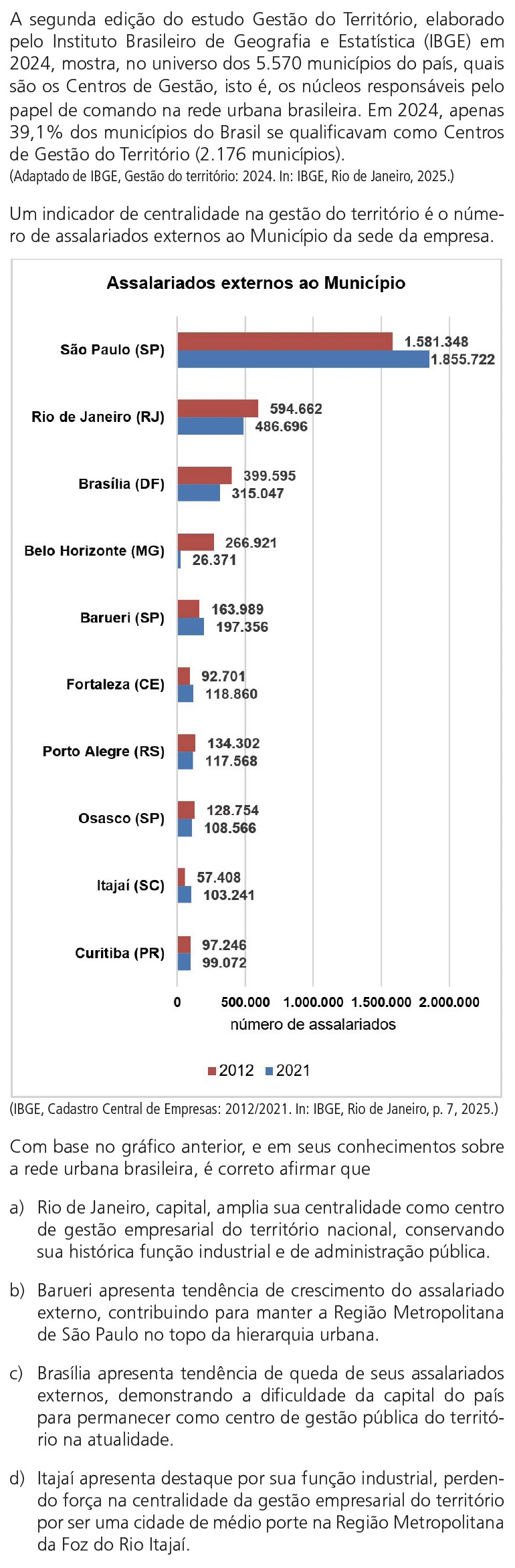 O gráfico em questão destaca o número de assalariados externos ao município como um dos indicadores da centralidade na gestão do território. Observa-se que munícipios como Rio de Janeiro (RJ) e Brasília (DF) reduziram o número de assalariados externos, fato que contribuiu para a diminuição de suas respectivas influências. No entanto, a capital do Brasil ainda guarda grande importância, fundamentada em seu papel de catalisador da integração nacional e da interiorização do desenvolvimento.