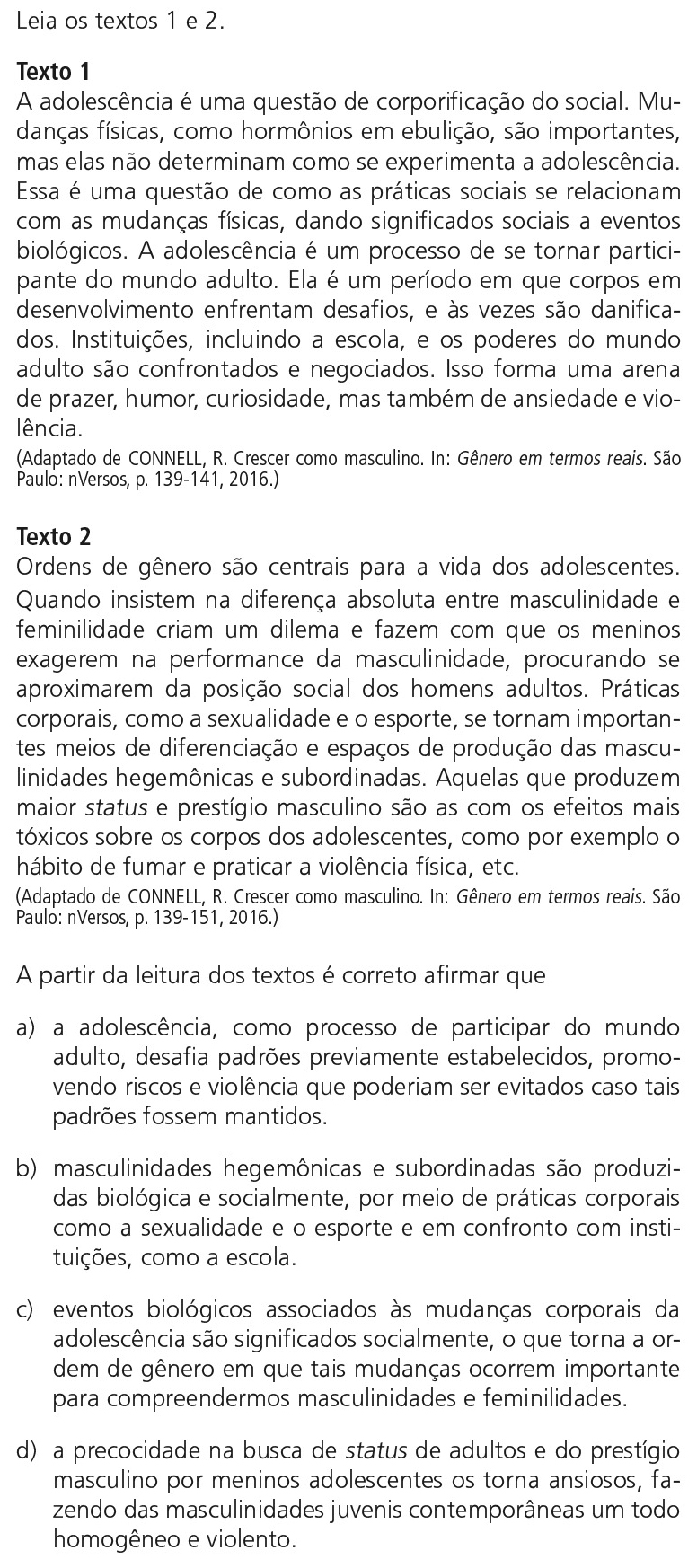 A questão mostra, nos textos apresentados, que a adolescência não é um fenômeno puramente biológico, mas um período em que transformações corporais ganham significado social. O texto 2 reforça que esse processo ocorre dentro de uma ordem de gênero, que pressiona especialmente os meninos a performarem modelos de masculinidade valorizados socialmente. Assim, compreender a adolescência exige entender como o corpo em mudança é interpretado socialmente e como essas interpretações produzem expectativas e hierarquias de gênero. Por isso, a alternativa correta é a C, pois reconhece que os eventos biológicos só adquirem sentido à luz da construção social do gênero.