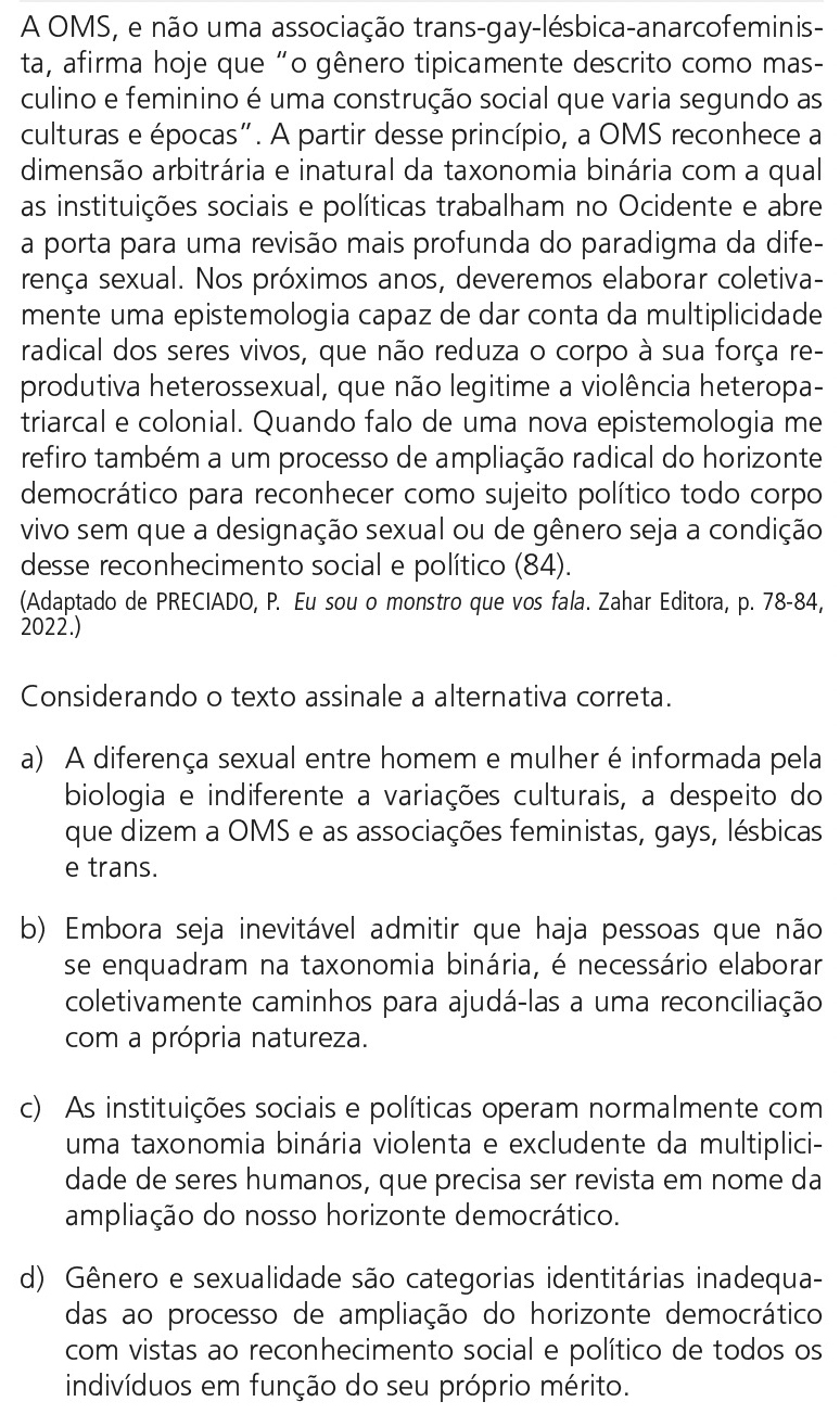 O texto (Preciado, citando a OMS) afirma que o gênero é construção social, denuncia a taxonomia binária com que operam as instituições e propõe revisá-la para ampliar o horizonte democrático, reconhecendo todo corpo vivo como sujeito político independentemente da designação sexual/de gênero. As alternativas (a) e (b) negam ou corrigem a não-binariedade; (d) desloca o critério para “mérito”, o que contraria a proposta de reconhecimento incondicional.