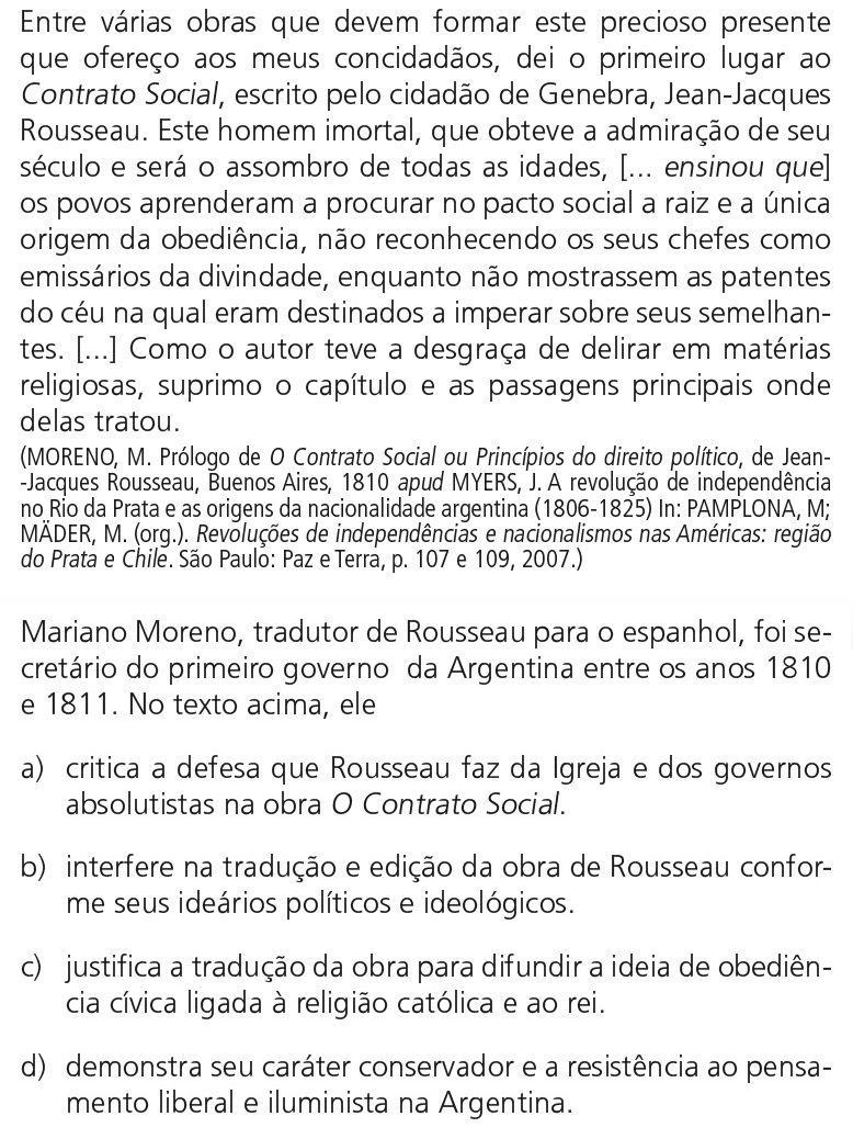 A questão apresenta um relato de Mariano Moreno (1778-1811), tradutor argentino das obras de Rousseau ao espanhol em princípios do século XIX. No excerto, o próprio Moreno afirma que, em sua opinião, Rousseau “teve a desgraça de delirar em matérias religiosas” e, por conta disso, o tradutor optou por suprimir essas passagens e capítulos da tradução à língua espanhola. Dessa forma, as concepções individuais de Moreno interferiram diretamente sobre as edições da obra de Rousseau em circulação pela Argentina no período.