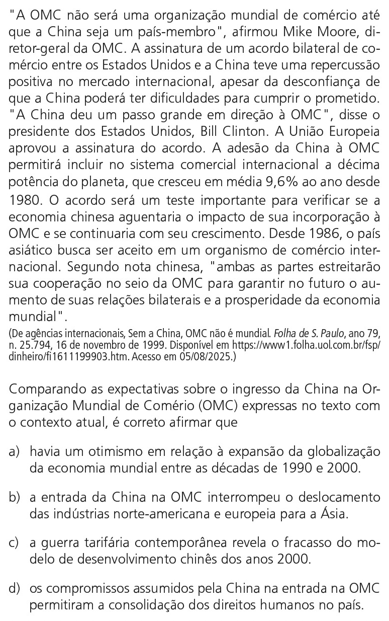A entrada da China na OMC, em 2001, foi comemorada por diversos países do Norte Global, que viam nesse evento um compromisso chinês com uma economia mais aberta e segura para investimentos externos, permitindo, assim, a expansão da globalização e a aceleração do deslocamento industrial em direção ao continente asiático. Vale apontar que a China, embora tenha firmado uma série de compromissos, continua sendo acusada de violar os direitos humanos, como na região de Xinjiang.