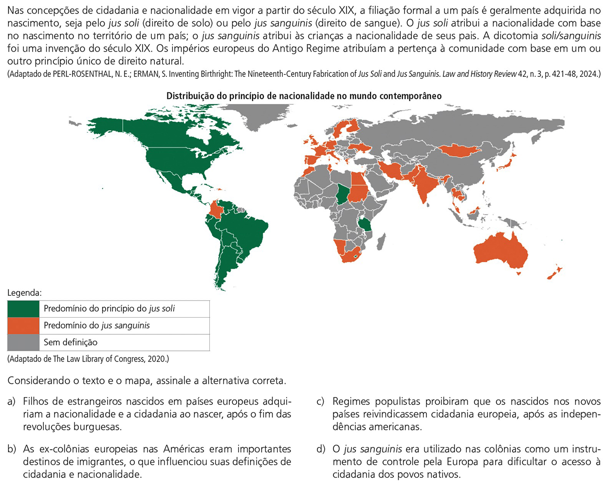 O mapa apresenta a predominância do princípio do jus soli nos países do continente americano – situação em que a nacionalidade é adquirida pelo nascimento no território, independentemente da origem dos pais.