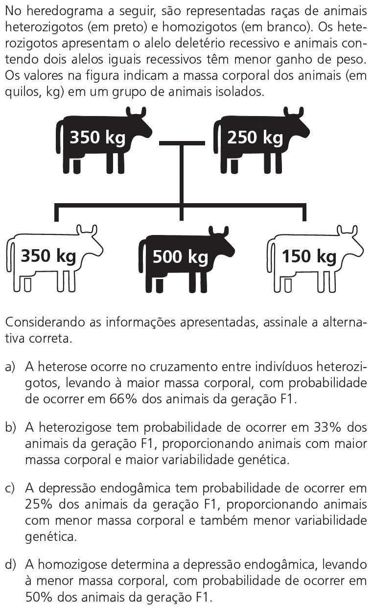 No cruzamento entre indivíduos heterozigotos (Aa), a probabilidade de ocorrência de descendentes com a depressão endogâmica (aa), fenótipo que se manifesta como animais de menor massa corporal, é de 25%.