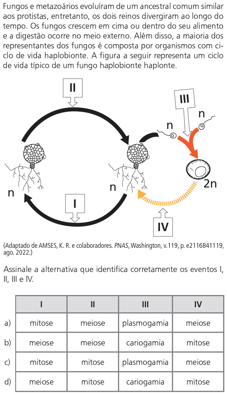A partir do ciclo haplobionte haplonte, observa-se que os eventos I e II se referem à ocorrência de mitoses, uma vez que a ploidia se mantém constante nos dois indivíduos representados. O processo III indica a fusão dos citoplasmas de dois gametas derivados de fungos diferentes, fenômeno reconhecido como plasmogamia, resultando na formação do zigoto diploide (2n). Por fim, o evento IV retrata a ocorrência da meiose zigótica, evidenciada pela redução da ploidia, resultando em um fungo haploide.