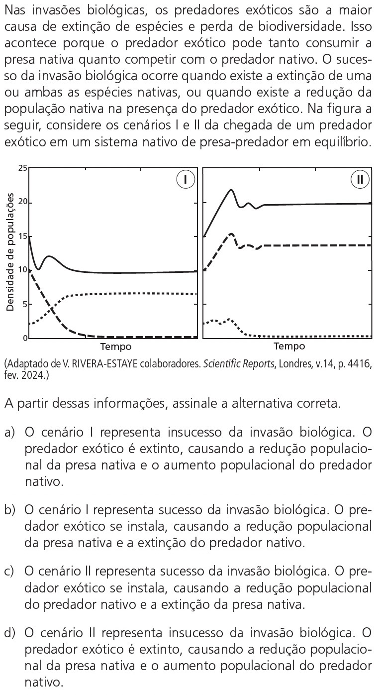 A partir da análise do Cenário I, observa-se um típico caso de invasão biológica. O predador exótico, representado pela linha pontilhada, apresenta um aumento populacional expressivo. Como resultado, ocorre a redução da população da presa nativa, indicada pela linha contínua. A introdução do predador invasor também provocou a extinção do predador nativo, representado pela linha tracejada. Já o Cenário II não evidencia relações ecológicas coerentes com as alternativas apresentadas.