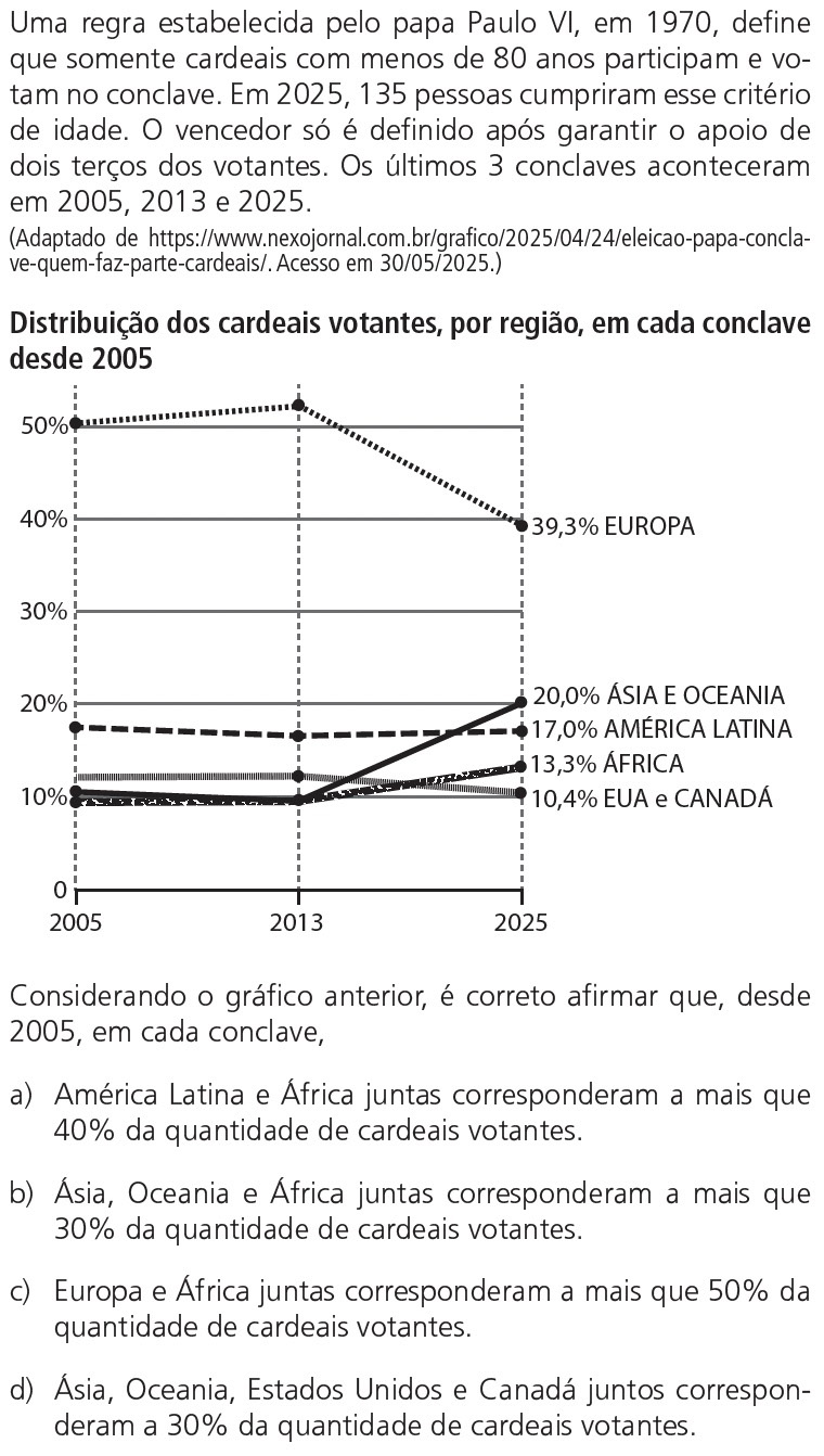 A) ERRADA: Em 2025, América Latina e África juntas corresponderam a 30,3% do número de cardeais votantes.