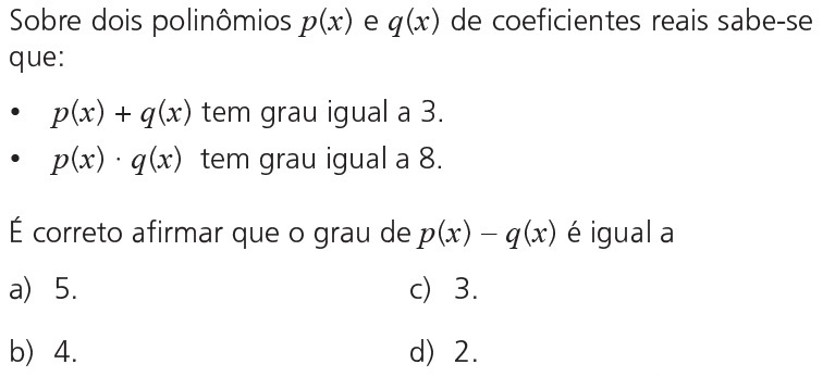 De “p(x) · q(x) tem grau igual a 8” podemos concluir que os possíveis graus para p(x) e q(x) são:
