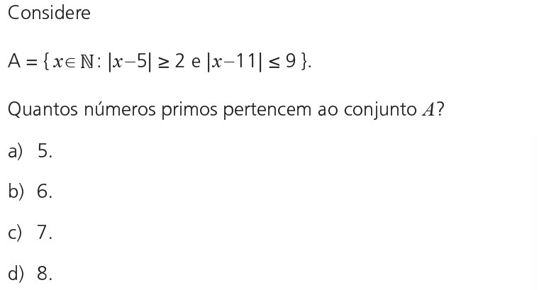 Os números primos que satisfazem (II) são 2, 3, 5, 7, 11, 13, 17 e 19, totalizando 8 números. Destes, somente o número 5 não satisfaz à condição (I). Logo, existem 7 números primos no conjunto A.