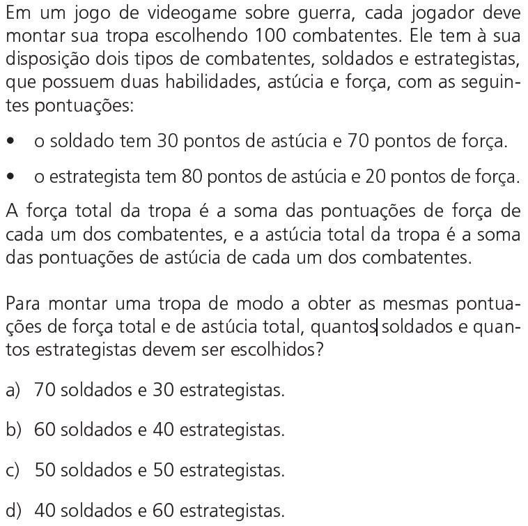 Seja s a quantidade de soldados e e a quantidade de estrategistas escolhidos. A astúcia total da tropa é 30s + 80e e a força total da tropa é 70s + 20e. Como as pontuações devem ser iguais, tem-se: