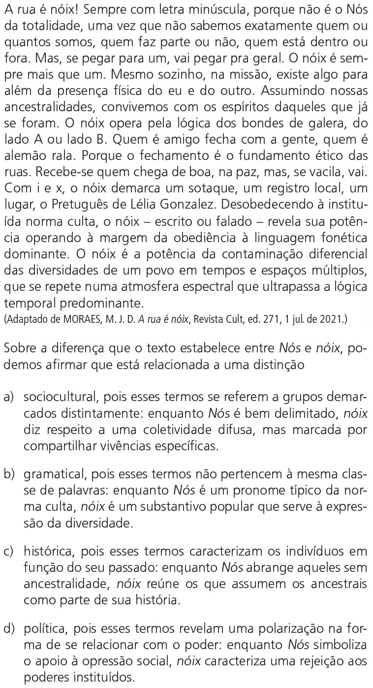 Além disso, o enunciador defende que o grupo abarcado pela variante “nóix” compõe uma coletividade difusa, pois não se saberia “exatamente quem ou quantos somos, quem faz parte ou não, quem está dentro ou fora”. Ainda assim, haveria uma ética comum norteando as experiências desse grupo, o que permite afirmar que compartilham “vivências específicas”. Por oposição, a variante da norma-padrão “Nós” (grafada no excerto em maiúscula) é vinculada, no texto, à ideia de totalidade, o que, segundo o enunciador, faria esse termo assumir uma referência mais bem delimitada.