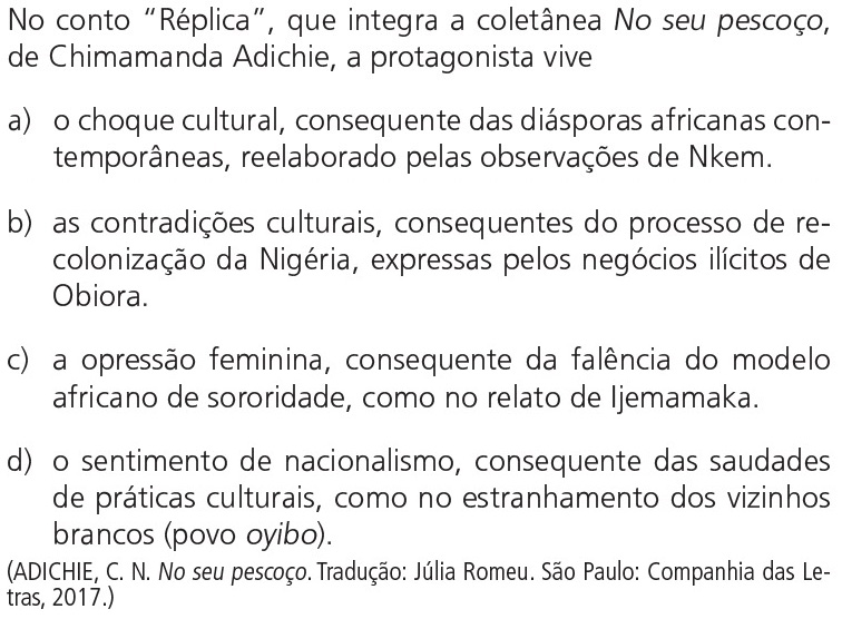 Os contos de No seu pescoço, de forma geral, têm como tema o choque cultural criado em consequência da diáspora africana contemporânea. A protagonista do conto “Réplica”, Nkem, vive um conflito pessoal na Filadélfia devido, principalmente, à ausência do marido Obiora, que se divide entre a casa da família nos Estados Unidos e a propriedade que mantém em Lagos. Depois de saber da traição dele, que mantinha uma amante nigeriana, ela decide retornar ao seu país de origem.