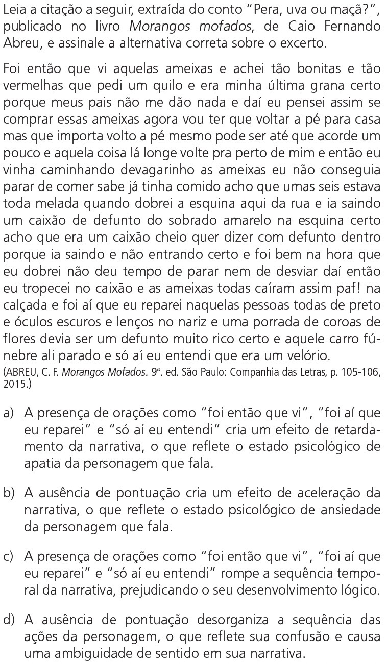 No excerto, a personagem relata ao seu psicanalista eventos ocorridos antes da chegada ao consultório. A ausência de pontuação cria um efeito de ansiedade, simulando a recuperação de uma vitalidade oposta ao estado de apatia no qual se encontrava até então.