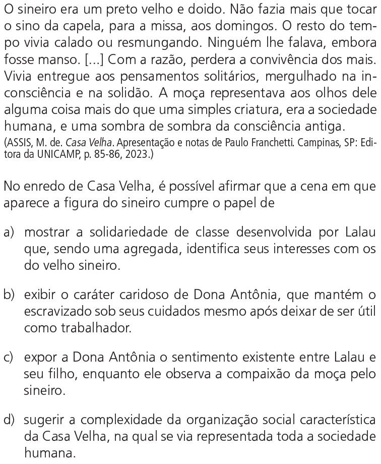 Pode-se dizer que a presença do personagem sineiro no trecho transcrito cumpre o papel de aproximá-lo de Lalau, do ponto de vista da solidariedade de classe, considerando que a menina vivia como uma agregada da família de Dona Antônia, não pertencendo ao grupo de personagens privilegiados. No fragmento, há o reforço da perspectiva do sineiro, que vivia “mergulhado na inconsciência e na solidão” em relação a Lalau. O trecho afirma que “A moça representava aos olhos dele alguma coisa mais do que uma simples criatura, era a sociedade humana, e uma sombra de sombra da consciência antiga.” Lido isoladamente, como apresentado na prova, o trecho cumpre o papel de revelar uma solidariedade de classe desenvolvida entre eles, de acordo com o que aponta a alternativa A.