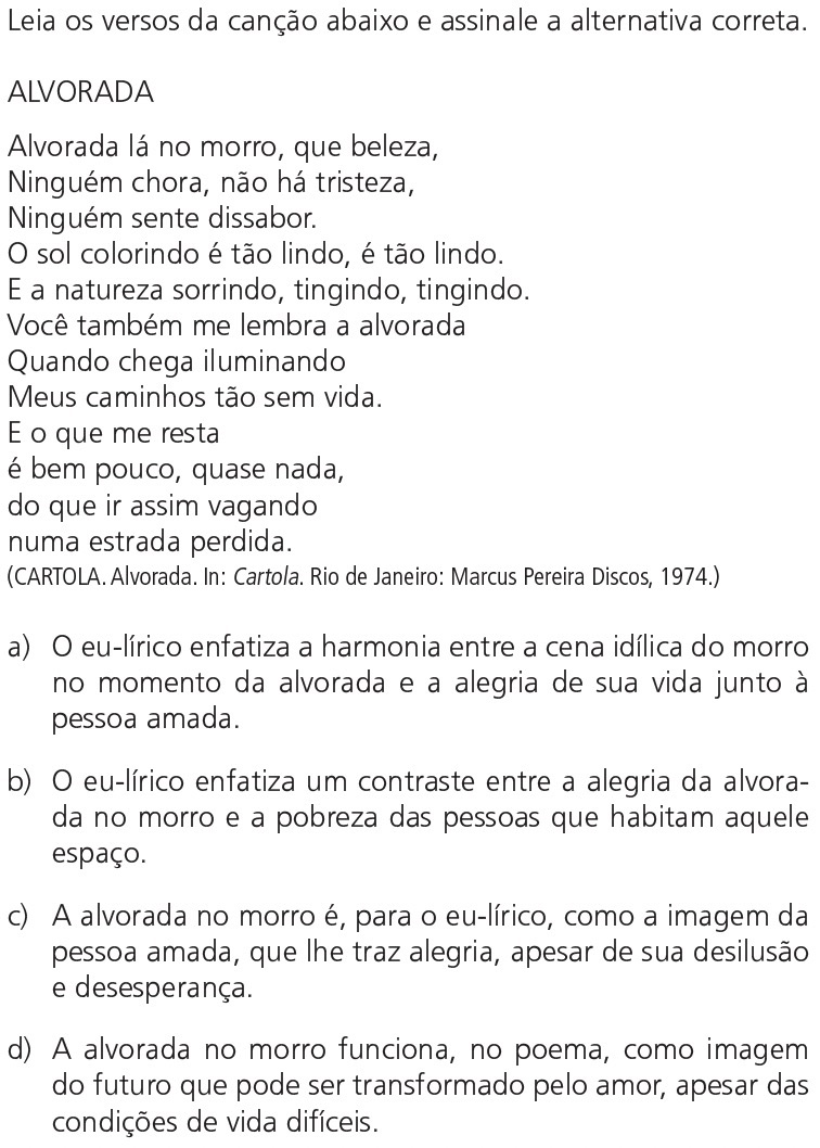 A letra da canção de Cartola estabelece uma comparação entre a natureza e a situação sentimental do enunciador. Nessa comparação, a beleza da alvorada suaviza a vida no morro, transmitindo a impressão de que “Ninguém chora, não há tristeza / Ninguém sente dissabor”. Da mesma forma, a amada ilumina os “caminhos tão sem vida” do eu lírico.