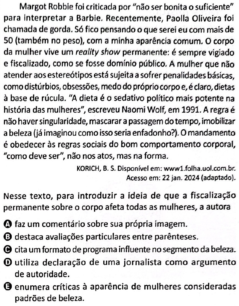 Dessa forma, fica difícil escolher entre as alternativas A e E. Ambas contribuem, na progressão do texto, para “introduzir a ideia de que a fiscalização sobre o corpo afeta todas as mulheres”, pois, ao mesmo tempo, a autora “faz um comentário sobre a própria imagem” (alternativa A), logo após reproduzir “críticas à aparência de mulheres consideradas padrões de beleza” (alternativa E).