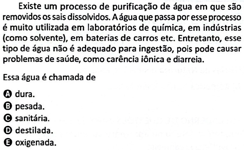 A destilação é o processo de separação de misturas em que sólidos encontram-se dissolvidos num líquido, no caso em questão, a água. A água que passa por esse processo se torna pura e recebe o nome de água destilada.
