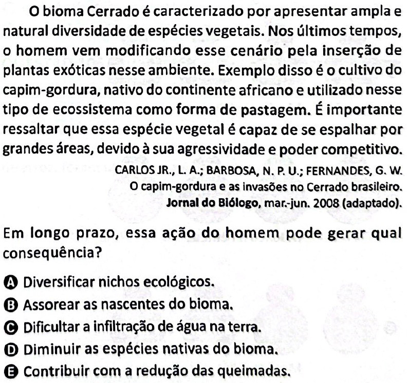 O capim gordura é uma espécie exótica com potencial de se tornar uma espécie invasora, dado seu alto poder de competir com as espécies nativas do Cerrado.