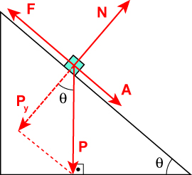 Representando as forças em um corpo escorregando sobre um plano inclinado: