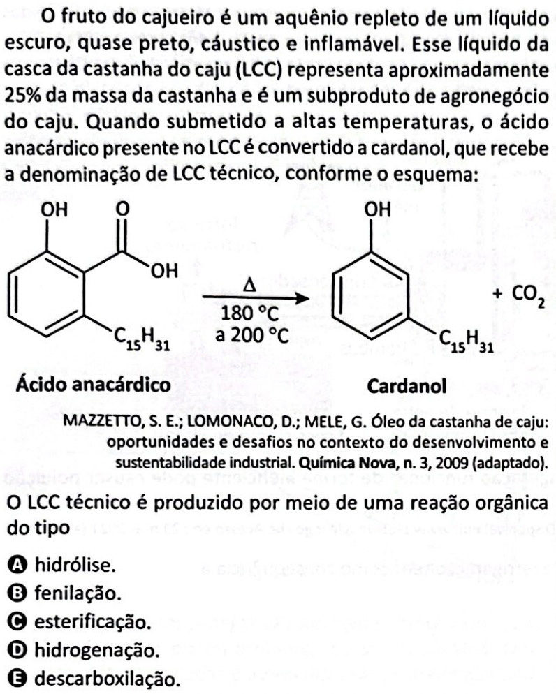 A partir da análise das estruturas apresentadas, nota-se que há a eliminação do grupo carboxila, destacado na imagem a seguir, na forma de gás carbônico (CO2), logo, trata-se de uma reação de descarboxilação.