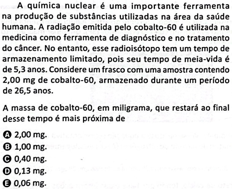 A meia-vida do cobalto-60 é de 5,3 anos e a amostra inicial dessa substância presente no frasco é de 2,00 mg. Portanto, a massa que restará dessa substância em 26,5 anos (5 períodos de meia-vida) será aproximadamente igual a 0,06 mg.