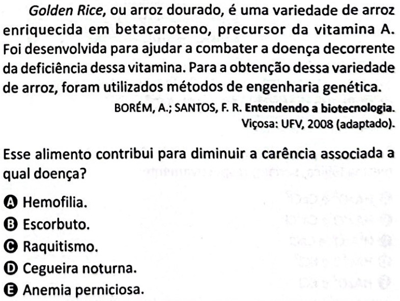 A hipovitaminose A manifesta-se por meio da cegueira noturna. O golden rice combate essa doença por ser rico em betacaroteno, substância precursora da vitamina A.