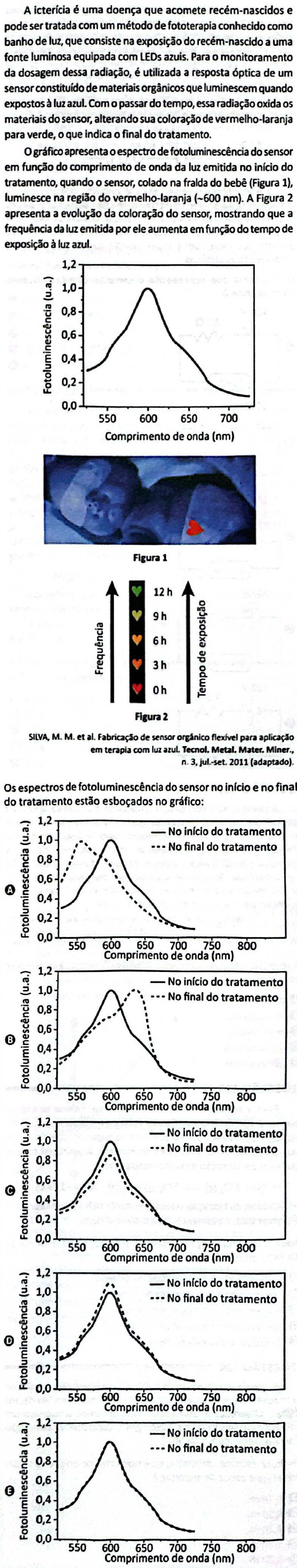 O gráfico fornecido apresenta a fotoluminescência do sensor em função do comprimento de onda da luz emitida no início do tratamento. A figura 2 informa que, com o passar do tempo de tratamento, a frequência emitida aumenta. Assim, ao considerar que a velocidade da radiação eletromagnética é constante, a frequência da onda é inversamente proporcional ao comprimento de onda (v = λ · f). Dessa forma, observa-se que, ao final do tratamento, com o aumento da frequência, o comprimento de onda irá diminuir. Então, o gráfico que melhor representa o início e o final do tratamento é o representado na opção A.